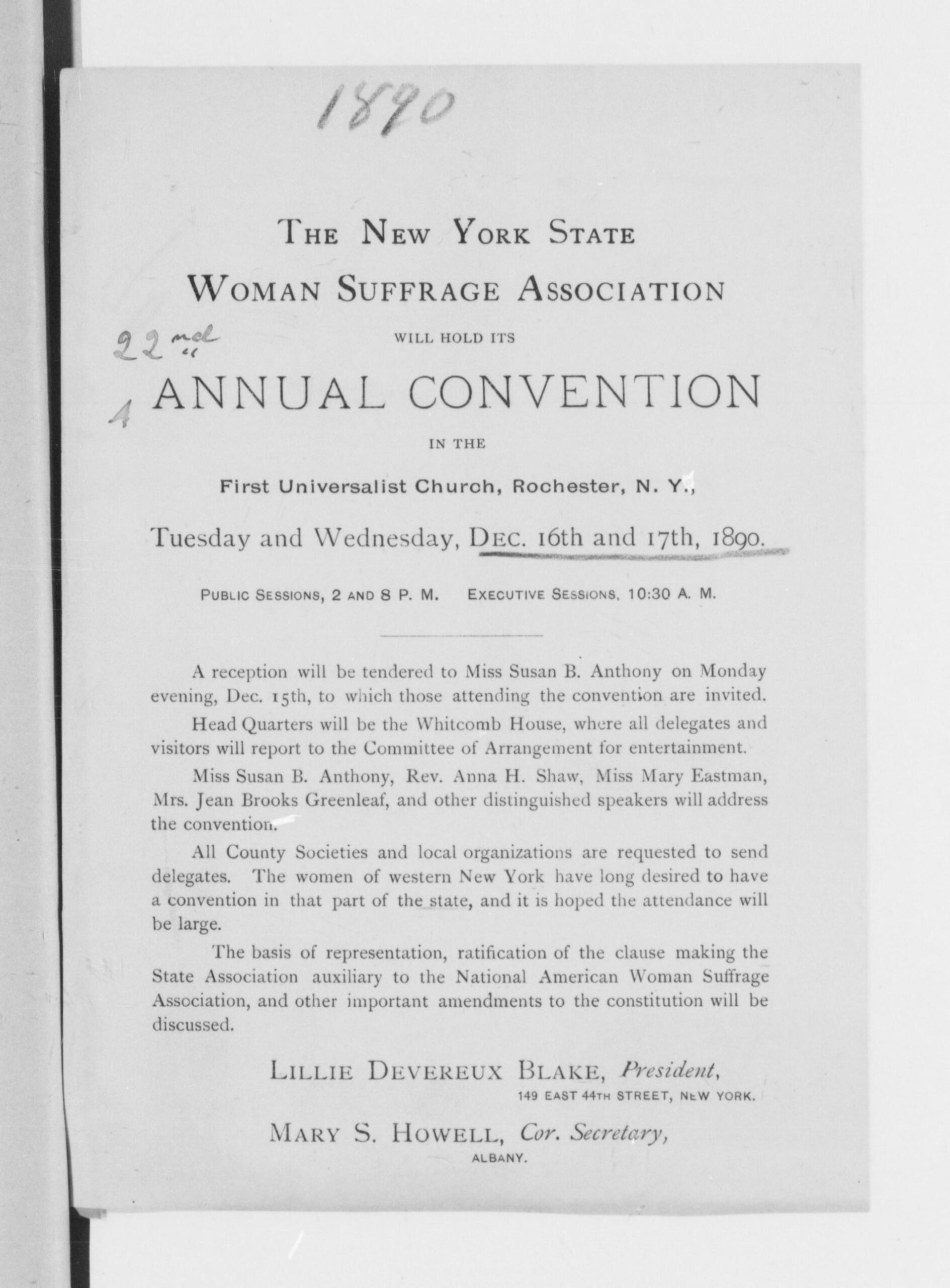 Press Release for 22nd NYWSA Convention in Rochester (Dec. 1890)