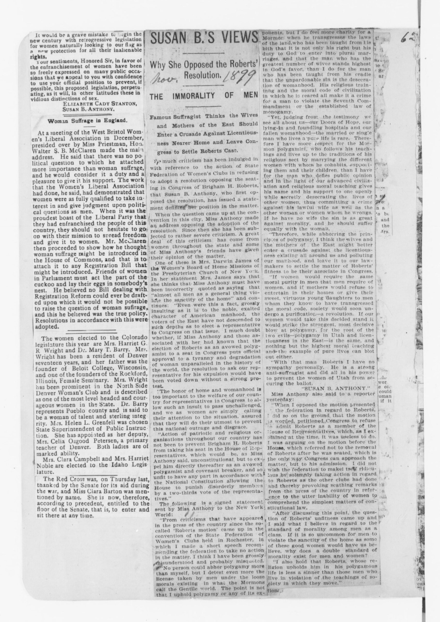 "Susan B.'s Views... Why she Opposed the Roberts' Resolution... The Immorality of Men" Examples of earned media coverage.