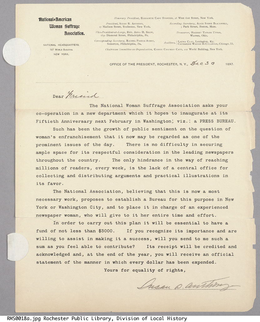 Susan B. Anthony’s Request for Press Bureau Donations (1897) Download Download is available until [expire_date] Version Download 0 File Size 105.66 KB File Count 1 Create Date March 14, 2025 Last Updated March 14, 2025 Susan B. Anthony's Request for Press Bureau Donations (1897) Rachel Foster Avery Letter Discussing Media Monitoring (1898) Carrie Chapman Catt (Aug. 1920)